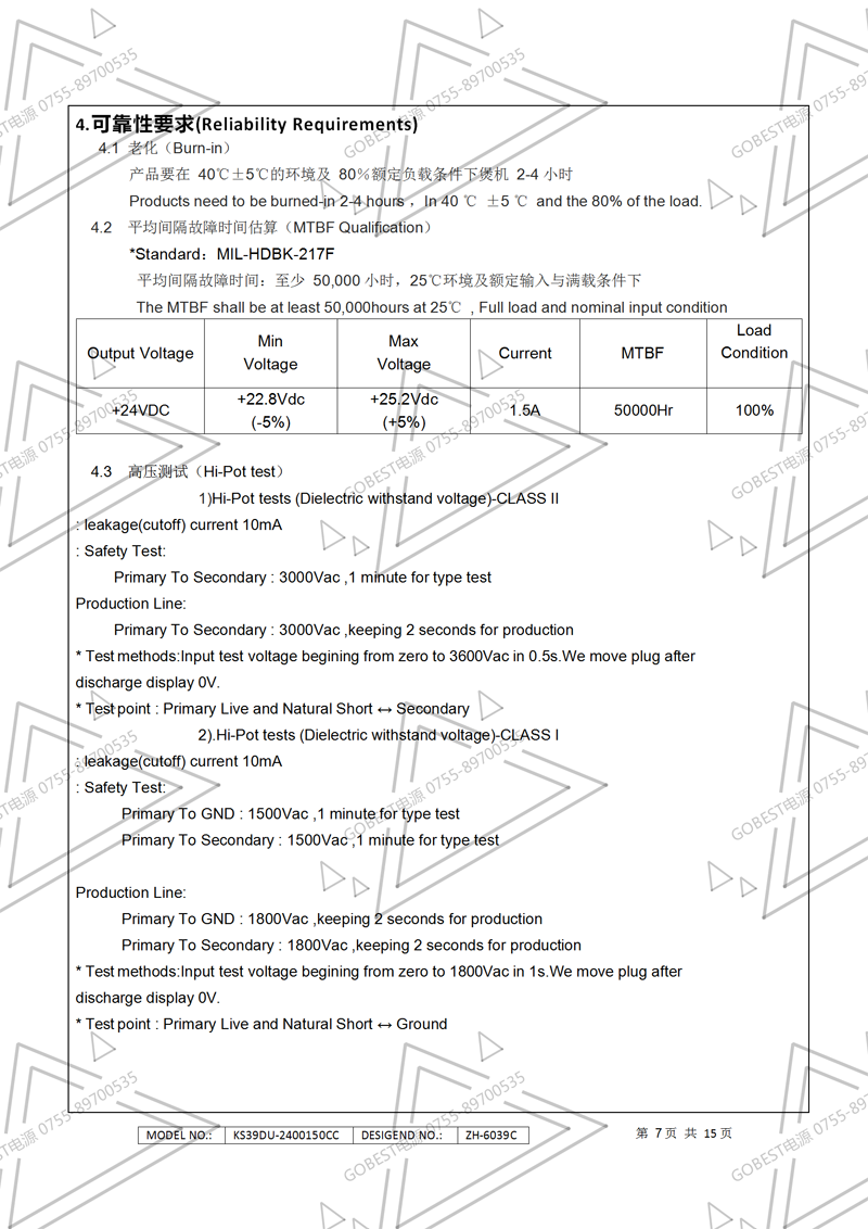 24V1.5A電源適配器規格書(國標插墻式)