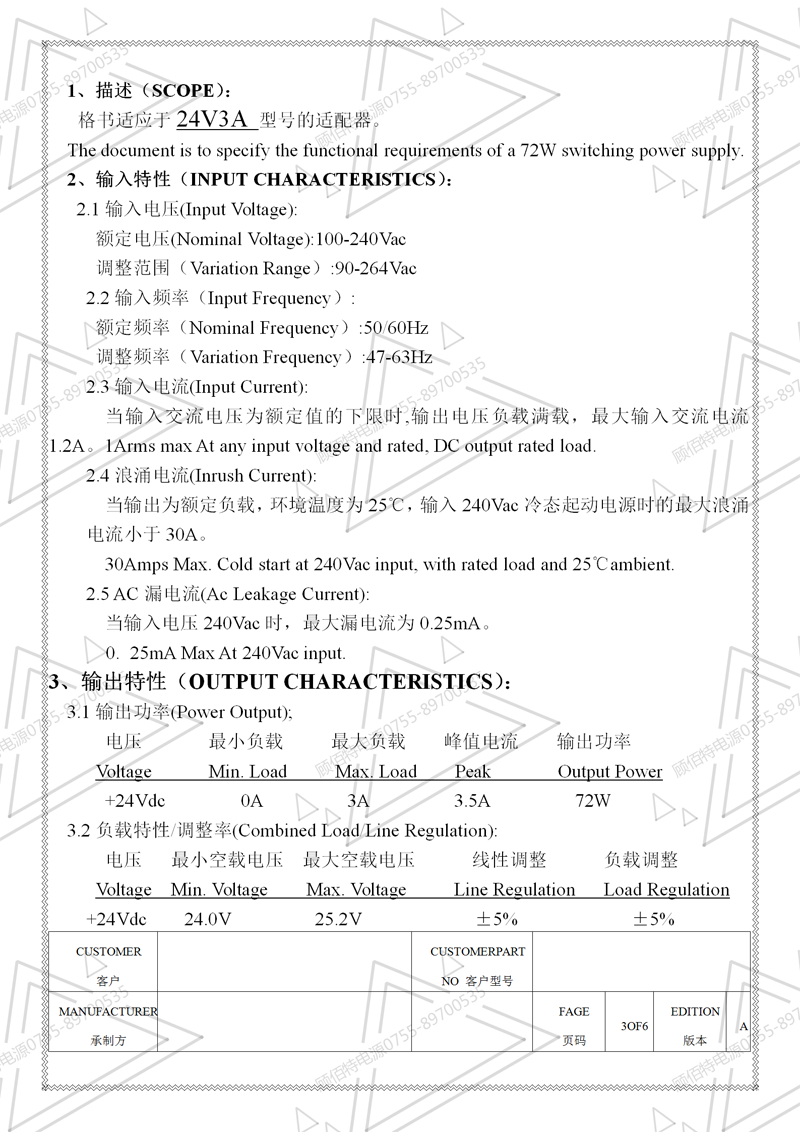 24V3A電源適配器規(guī)格書