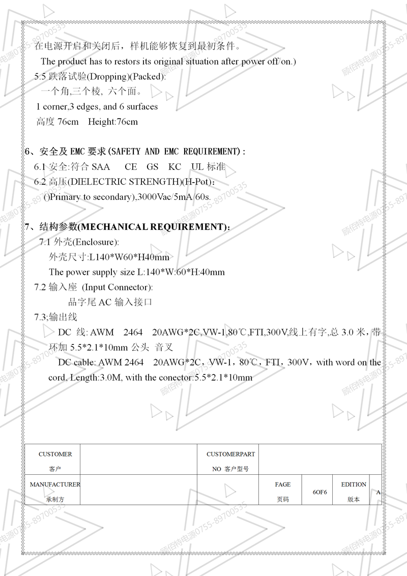 19V3.5A電源適配器規(guī)格書